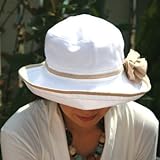 UVカット率99%以上の素材と エポカルオリジナルデザイン<ママ用3WAYUVカット帽子> つばを最大限に大きくしながらもなるべく視野が広い角度に設計しています。前ツバと後ろツバのまくり上げが自在で日陰のでき方と着心地よさをベストな状態に調節することができます。コサージュは取りはずし可能ですので、エレガントにもカジュアルにも合わせて使えます。 やわらかさを大切に仕上げていますので、頭になじみ蒸れにくい特徴があります。 丸めてコンパクトに携帯することもできます。 ■UVカット率:99%以上 (財)日本化学繊維検査協会調べ ■色:ホワイト×ベージュ ■サイズ:58cm <寸法> つば長さ11